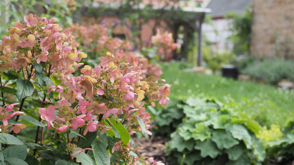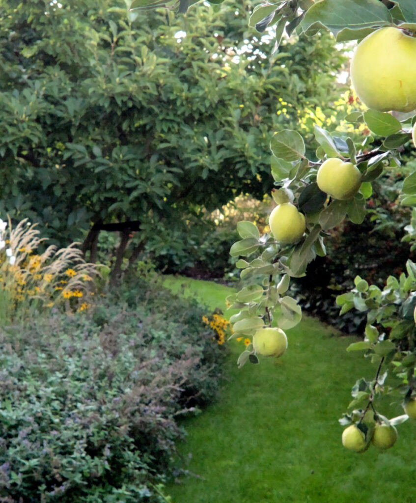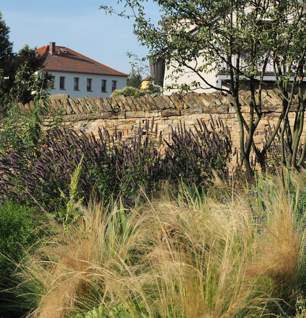 Die Bepflanzung aus Stauden und Gräsern unterstreicht den natürlichen und ländlichen Charakter der Gestaltung und verleiht dem Garten eine sanfte Wildheit, die in Kontrast zur historischen Umgebung steht.