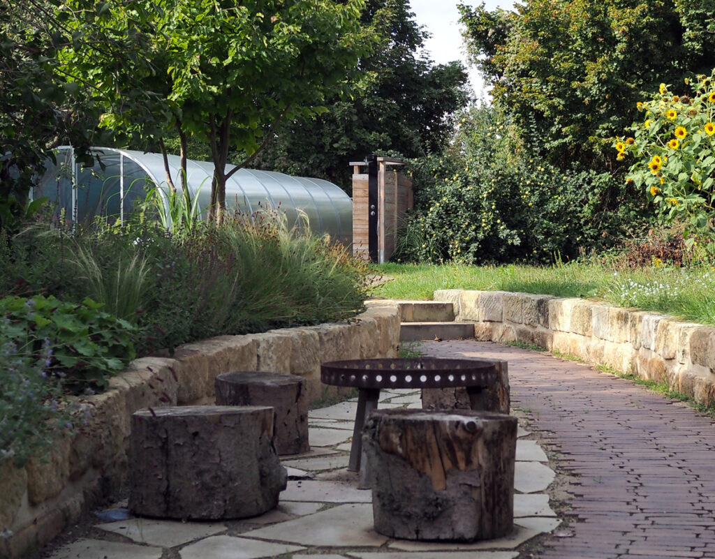 Im Anschluss lädt eine kleine Natursteinterrasse mit Feuerstelle und Sitzblöcken zum geselligen Beisammensein und zur romantischen Abendstimmung ein.