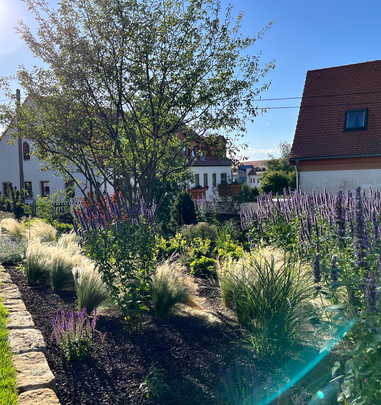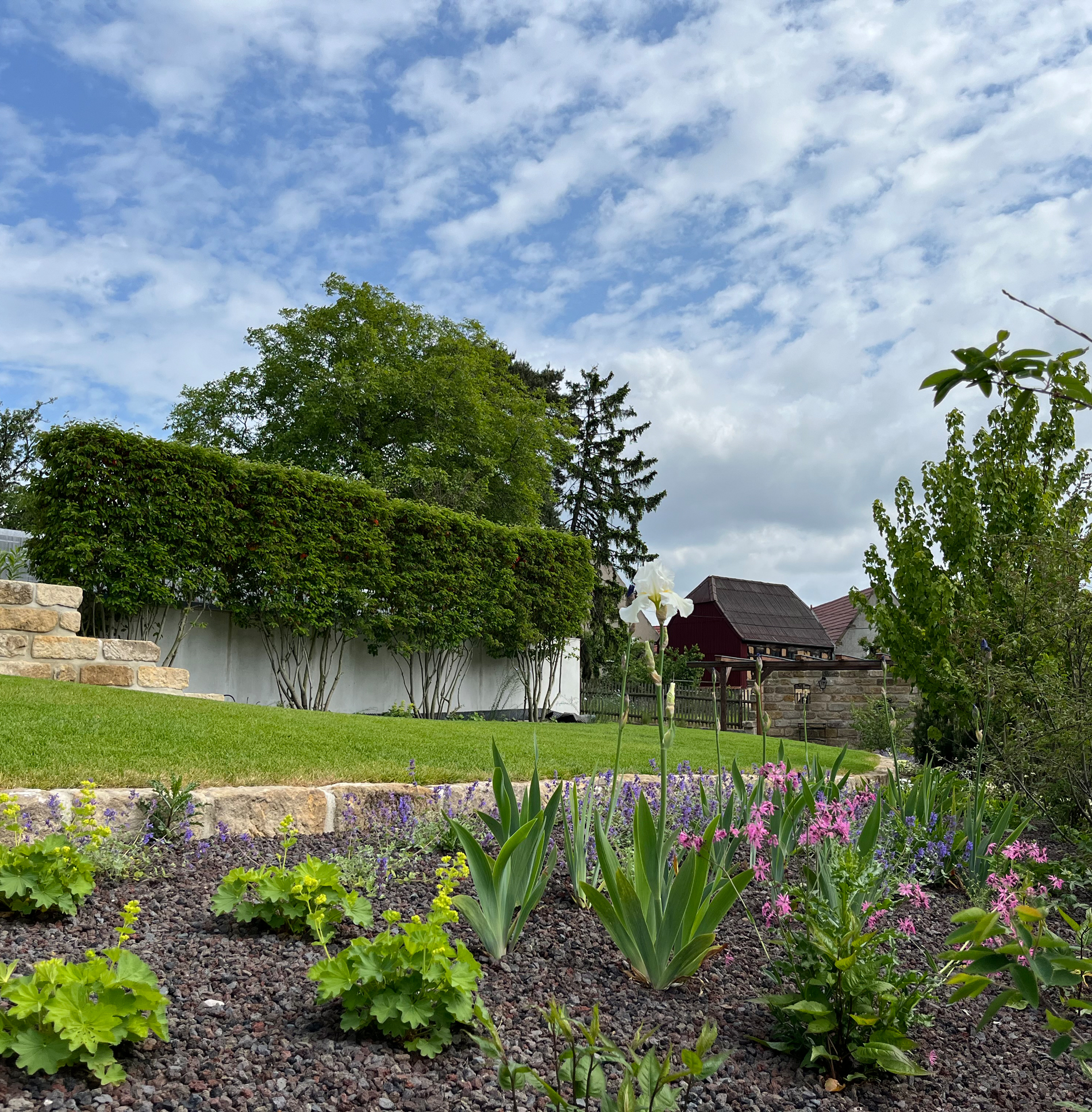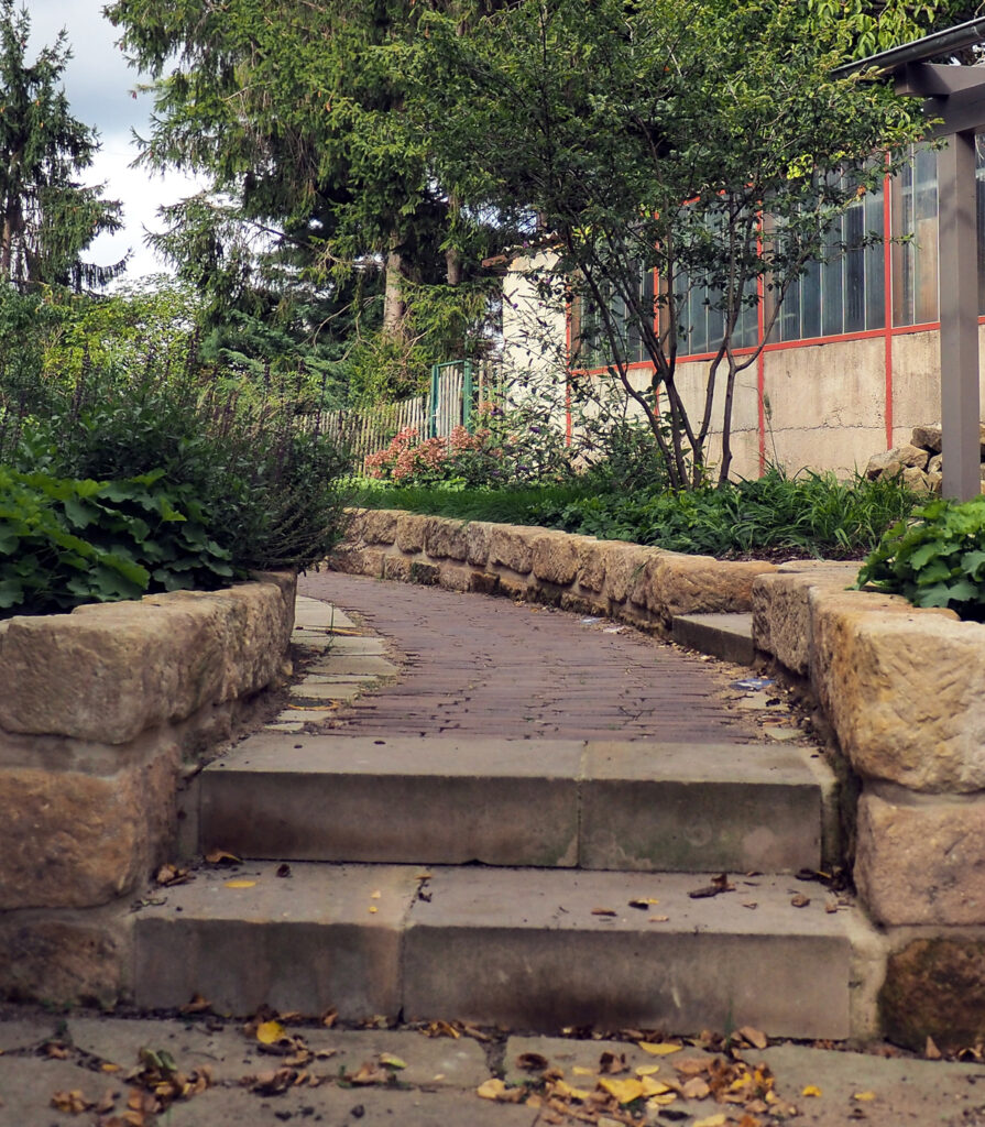 Hier entstand ein wahres Gartenparadies am historischen Dorfanger von Alttrachau in Dresden. Die Gestaltung vereint die zeitlose Schönheit von Sandsteinmauern und Klinkerweg. Diese Details haben den Garten in ein wahres Juwel verwandelt.