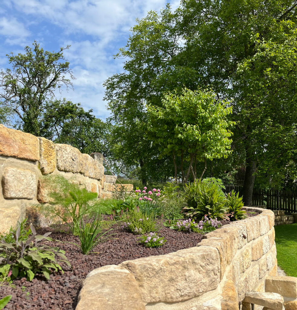 Pflanz- und Rasenflächen werden durch Sandsteinzeiler und -mauern geschickt abgesetzt. Diese natürlichen Elemente verleihen dem Garten eine strukturierte Eleganz und sorgen für eine Verbindung mit der umgebenden Landschaft.