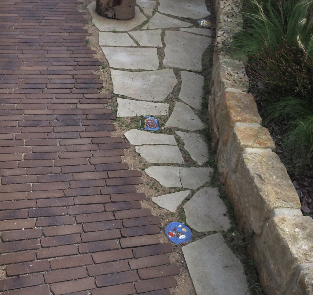 Charmant sind die Terrassen im Polygonalverband mit Einlegearbeiten aus den Kinderhänden der Auftraggeber. Hier lässt sich bei einer Zusammenkunft mit Familie und Freunden inmitten einer natürlichen Umgebung der Alltag vergessen.