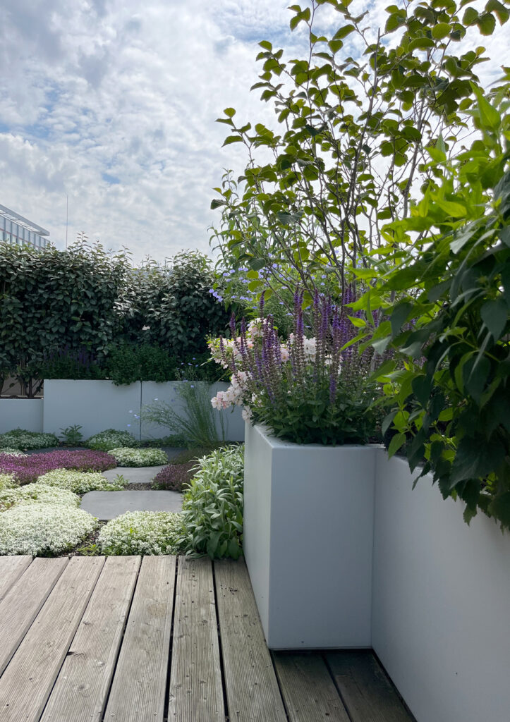 Ein besonderes Highlight dieser Terrasse ist der extensiv begrünte Bereich. Dieser wurde mit modernen Platten versehen und von einer üppig blühenden Pflanzung aus Polsterthymian umrahmt. Hier verschmilzt der moderne Stil mit der wilden Schönheit der Natur.